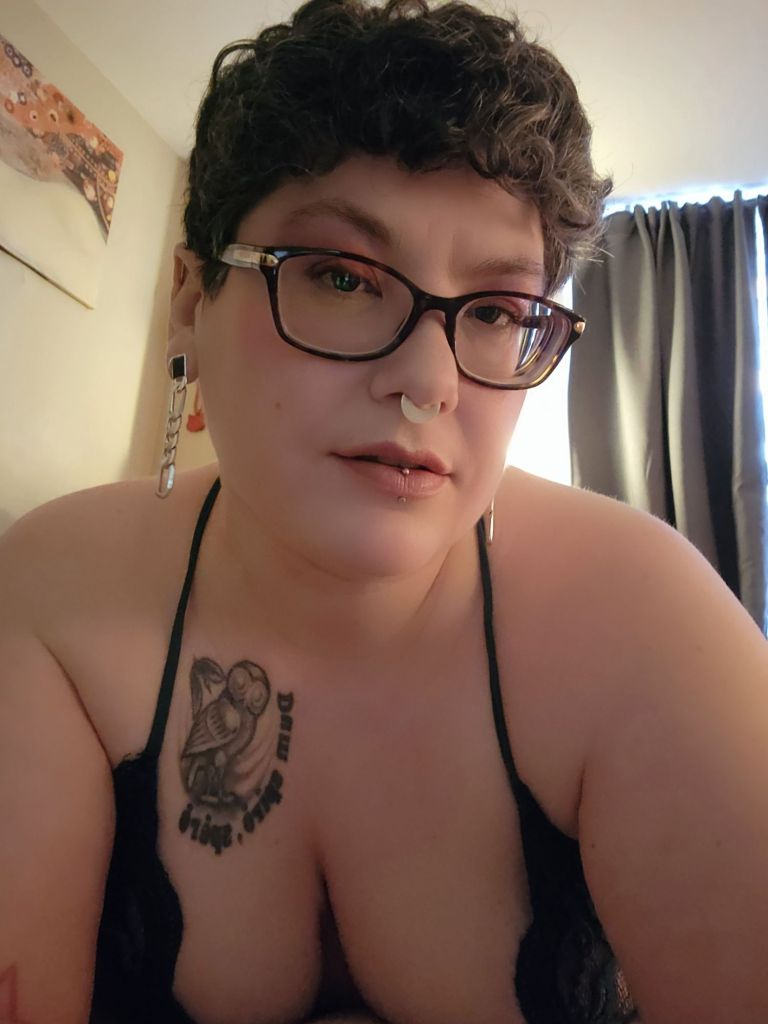 I am a curvy woman with a squishy belly and perky D-cups. I have been blessed with a soft body that yearns to be touched and explored. My skin is soft and my body hair groomed; I get waxes regularly and I love getting my nails done. My look is somewhat edgy (I am currently rocking a short pixie cut and I have several facial piercings, including my septum and my lip, as well as a handful of tattoos) but it belies a truly sweet interior.